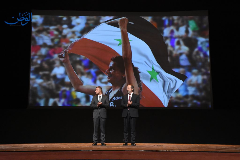 وبدأ الحفل بالوقوف دقيقة صمت وعزف النشيد الوطني، تبعه فيلم قصير عن عمريت مهد الأولمبياد، وألقى بعدها فراس معلا كلمة رحب فيها بالضيوف وجدد عهد الولاء والانتماء للوطن وقائده السيد الرئيس بشار الأسد.