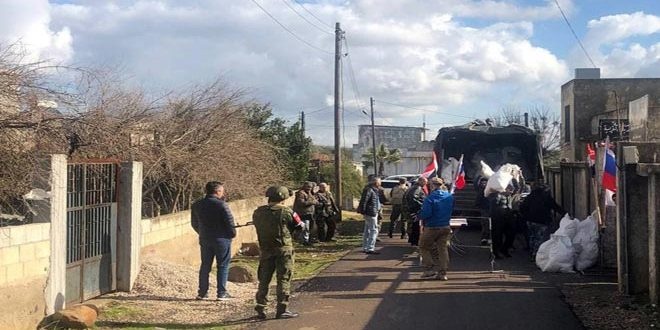 مركز التنسيق الروسي يوزع 500 حصة غذائية في بلدة السنديانة بريف حمص الغربي